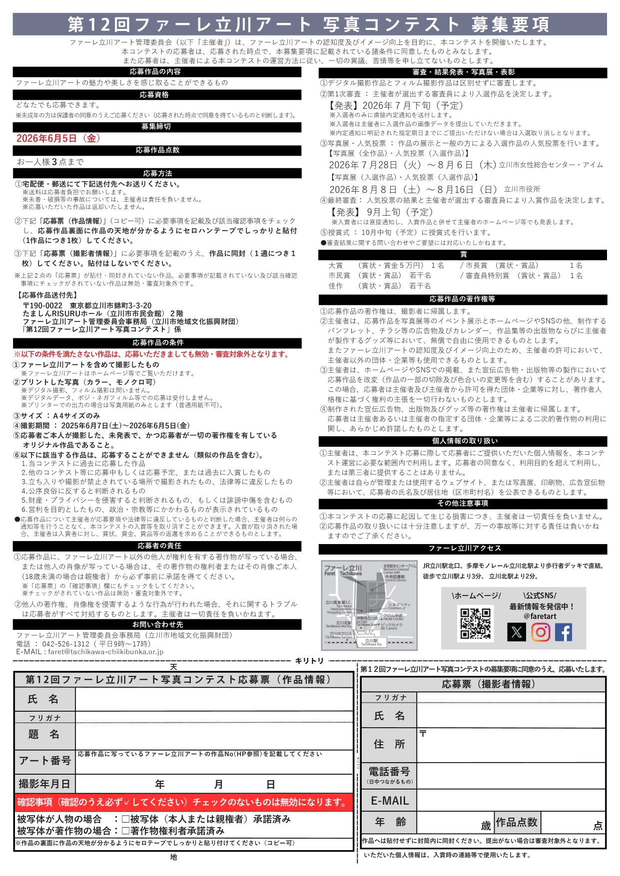 - The organizer reserves the right to freely use submitted works for exhibitions, website and social media postings, promotional materials such as pamphlets and flyers, and other publications such as calendars and photo collections, at no cost. Additionally, to enhance recognition and image promotion of Faret Tachikawa Art, the organizer may allow third-party organizations or companies to use the works with permission.
